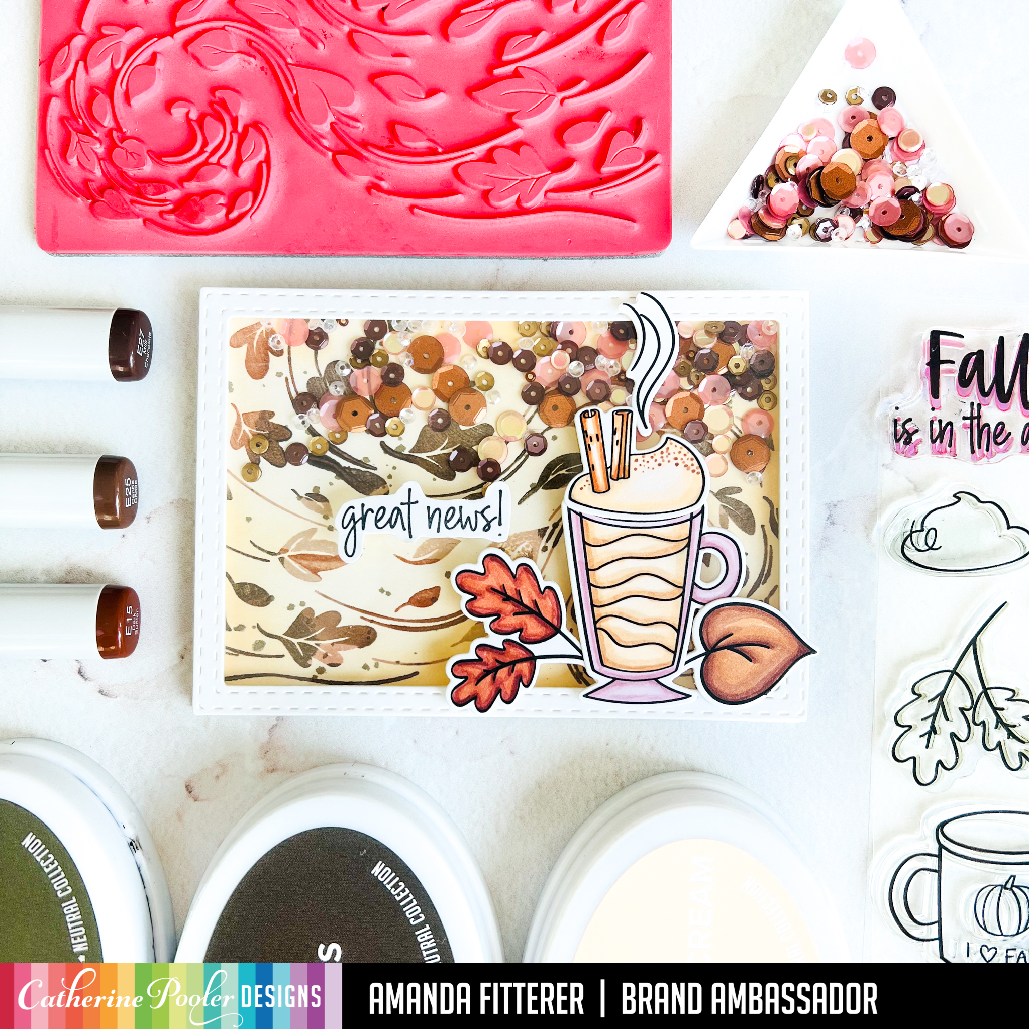 Check out this fun SHAKER CARD I made using the Blowing Leaves Background Stamp and the NEW BROWN INKS! My shakers are the new Mazatlan Sequins!