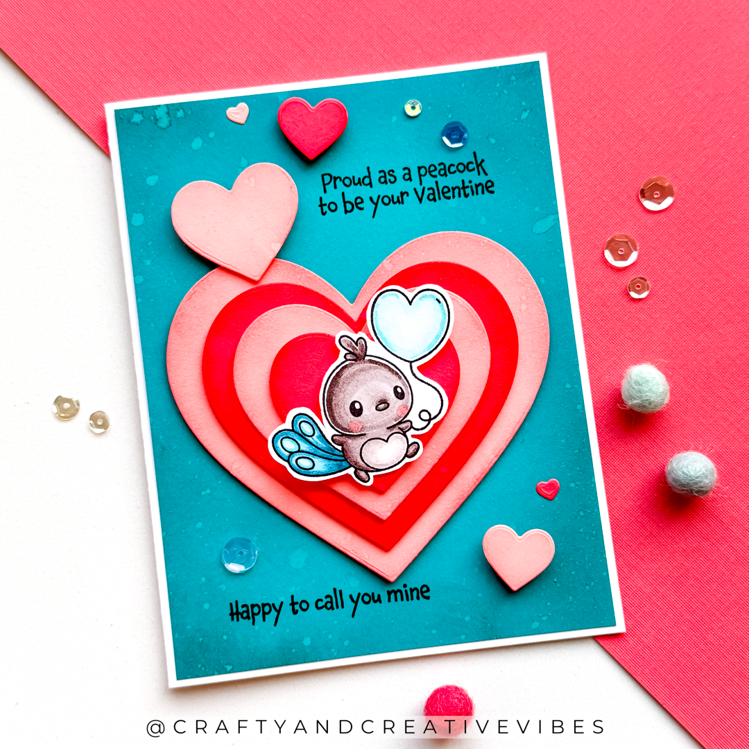 For this first card, I layered the Basic Hearts Dies behind my adorable little peacock! Then I added a few of the smaller ones around the card and added a few sequins for a little extra sparkle!
