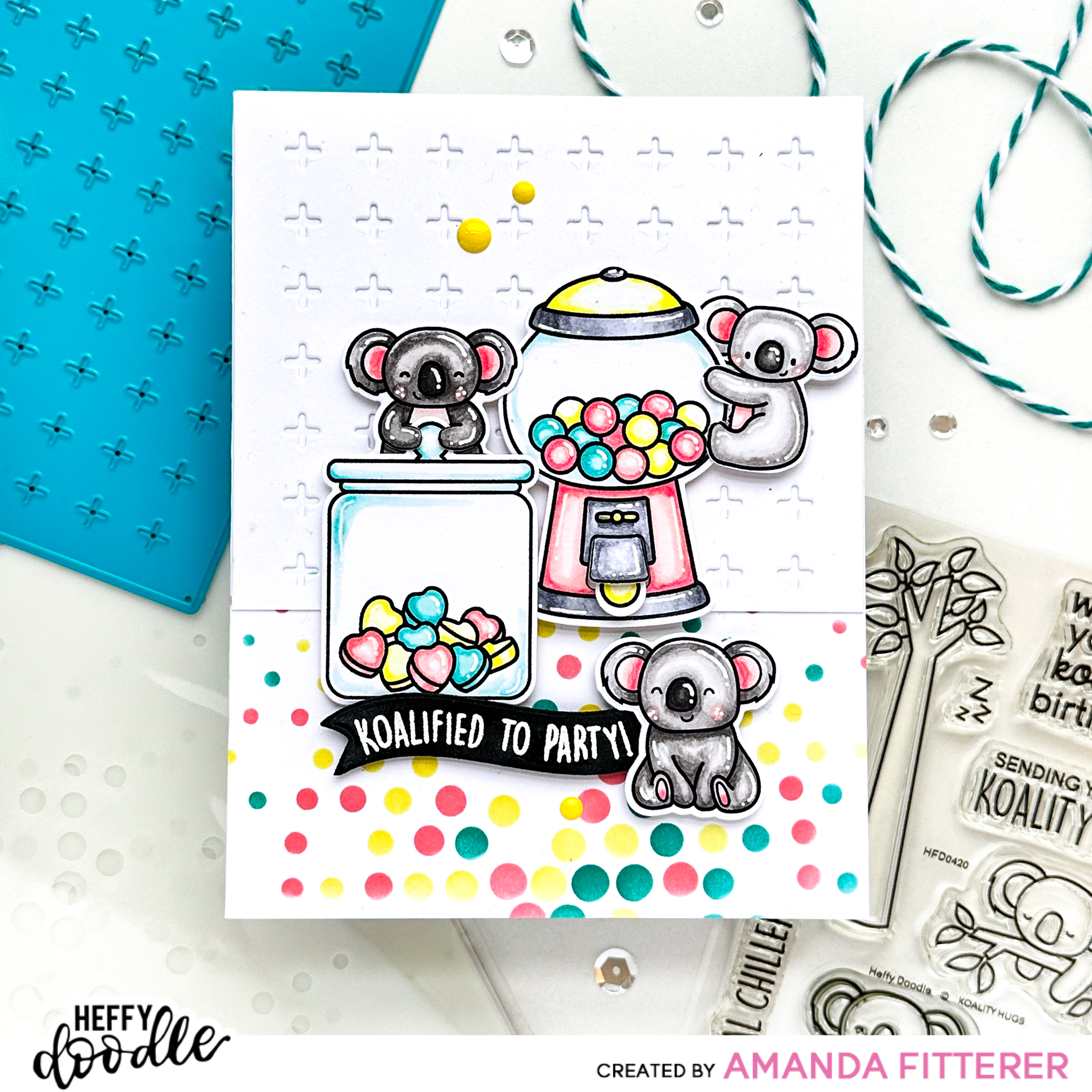 Next, I stamped all of my images from the Koality Hugs stamp set and colored them with Copic markers. Then, I die cut them out using the coordinating dies.