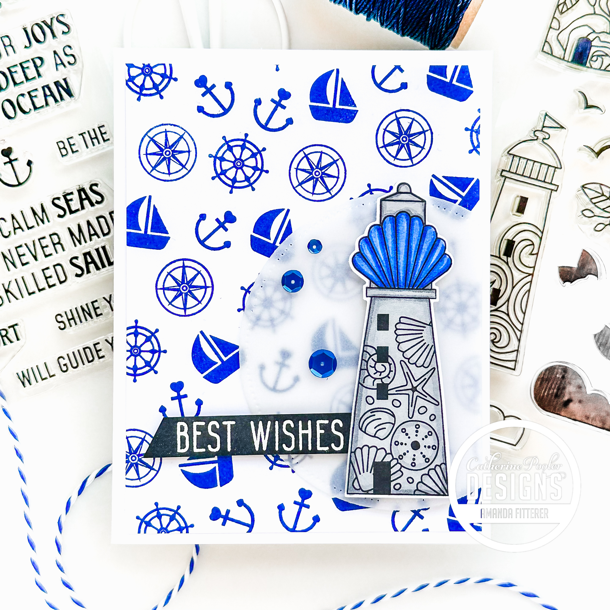 I used the Double Duty Circle DIes to cut out a piece of vellum. I stamped my Scenic Lighthouses Stamp with black ink and then colored it in with Copic markers. I cut it out using the coordinating dies. I added a few sequins to finish the card off!