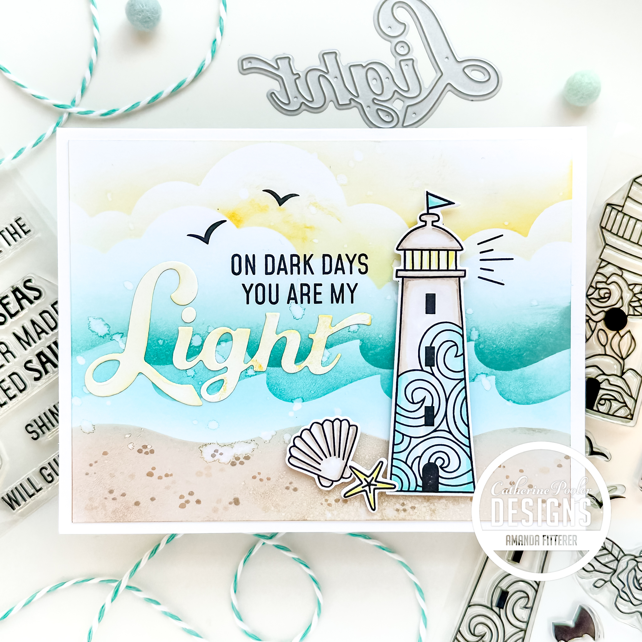 I stamped my Scenic Lighthouses Stamps with black ink and then colored them in with Copic markers. I cut them out using the coordinating dies. I cut my Light Word Die out of white cardstock and used Shea Butter to tint it yellow.