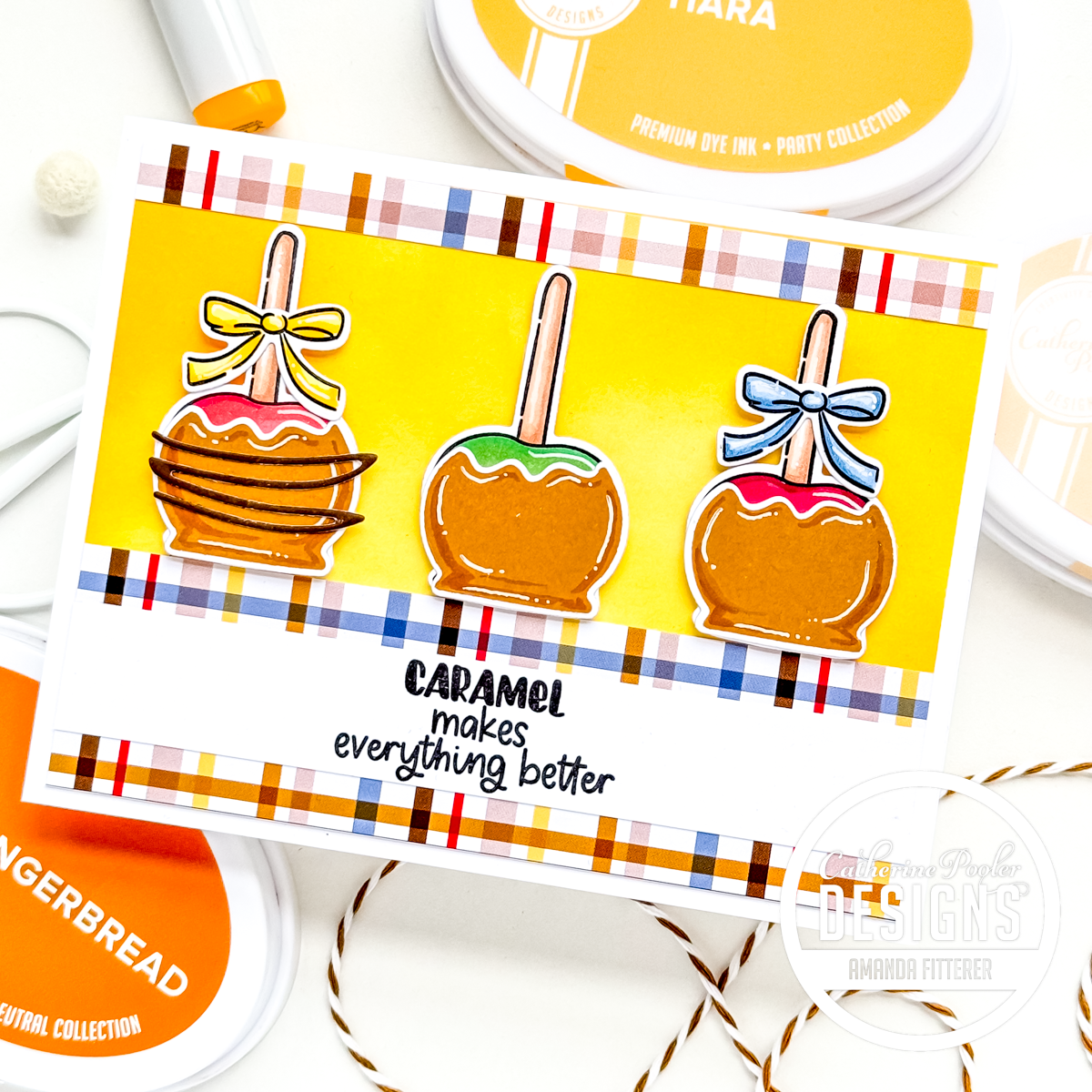 These yummy caramel apples come from the new Dipped & Sprinkled Stamp Set. To create this card, I used the inks: Buttercream Garden Party Gingerbread Rockin’ Red Spruce Tiara I also used Copic markers and a white Gelly Roll pen for highlights.