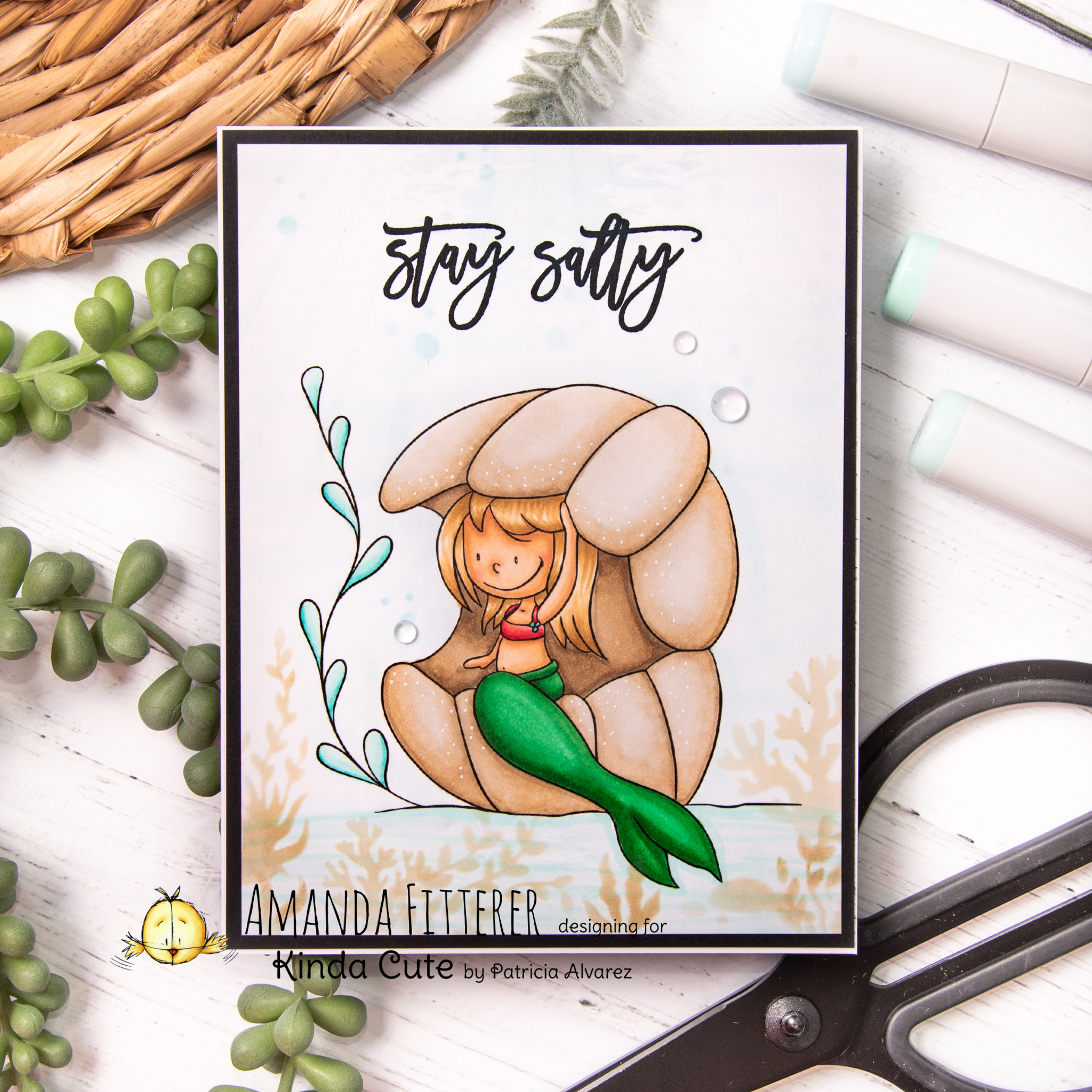 Today, I have my very first card I’ve made for the Kinda Cute by Patricia Alvarez design team! It’s this adorable Mermaid in Shell digi stamp!