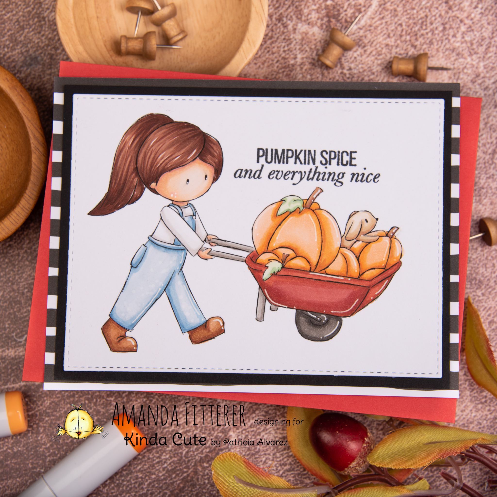 For this card, I stamped the large banner stamp in the center of the card panel. Then, I stamped the pumpkins and sunflowers around it. I colored them in with Copics and then added some black paint splatters around the card.