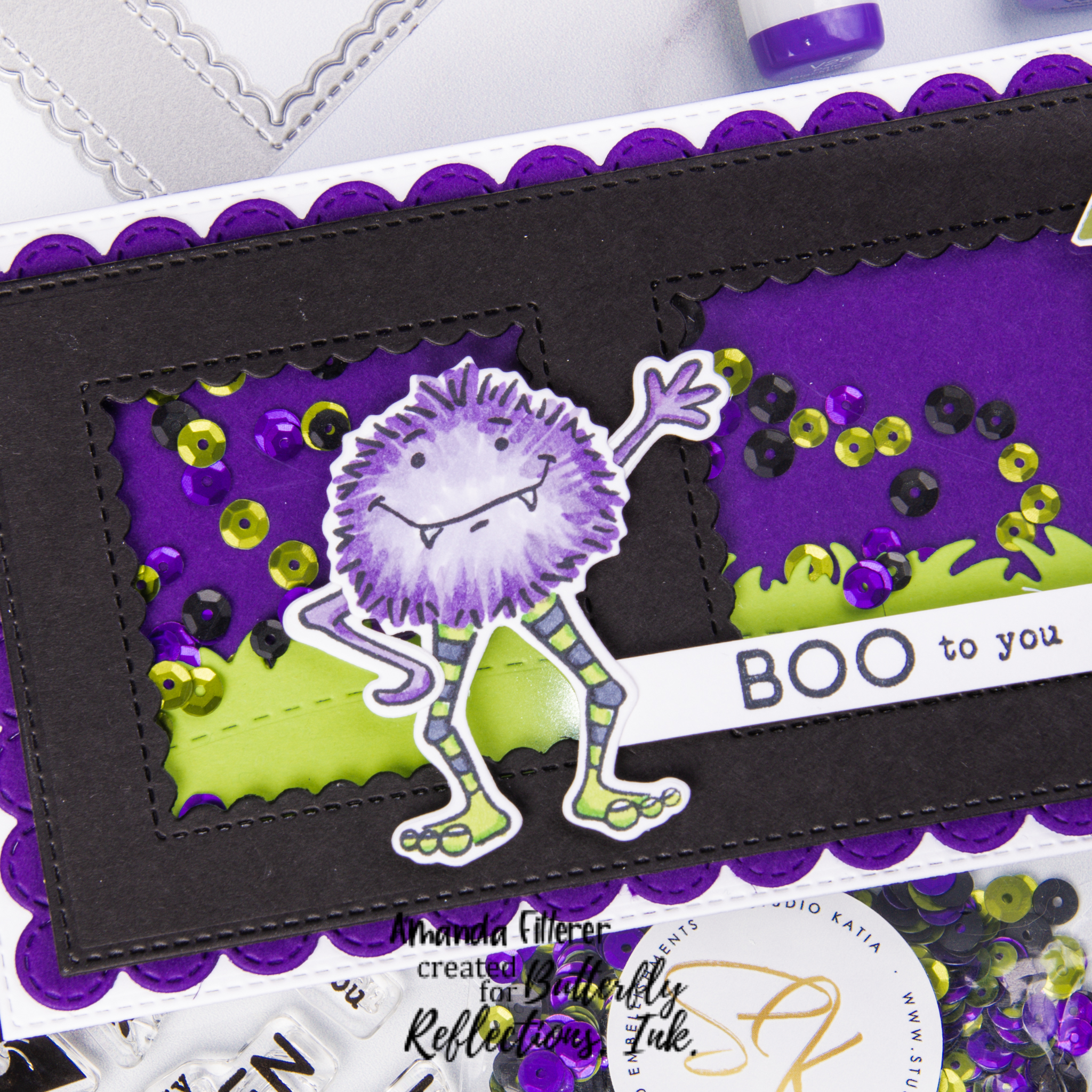 I am IN LOVE with this Count to Six Cover Plate Die that comes with the Boo Box! It’s so versatile and fun! All the products I used to make this card are included in the Boo Box! I just had some Lisbon Sequin Mix from my stash! Did you notice that gorgeous new Cast a Spell Embossing Powder? I used it for my tag and the spiderweb background!