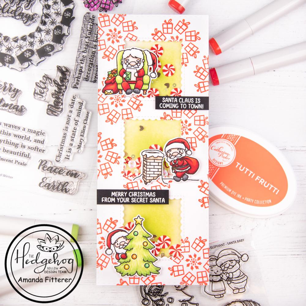 Have you gotten your Hedgehog Hollow October subscription box?! I just love the “Around Winter” stamp set that is included in the box. It’s so versatile! In my post a few weeks ago, I used it as a background and a focal point on 2 different cards! For this interactive card, I used it as a patterned background! The little gift boxes are just so cute they make the perfect pattern!