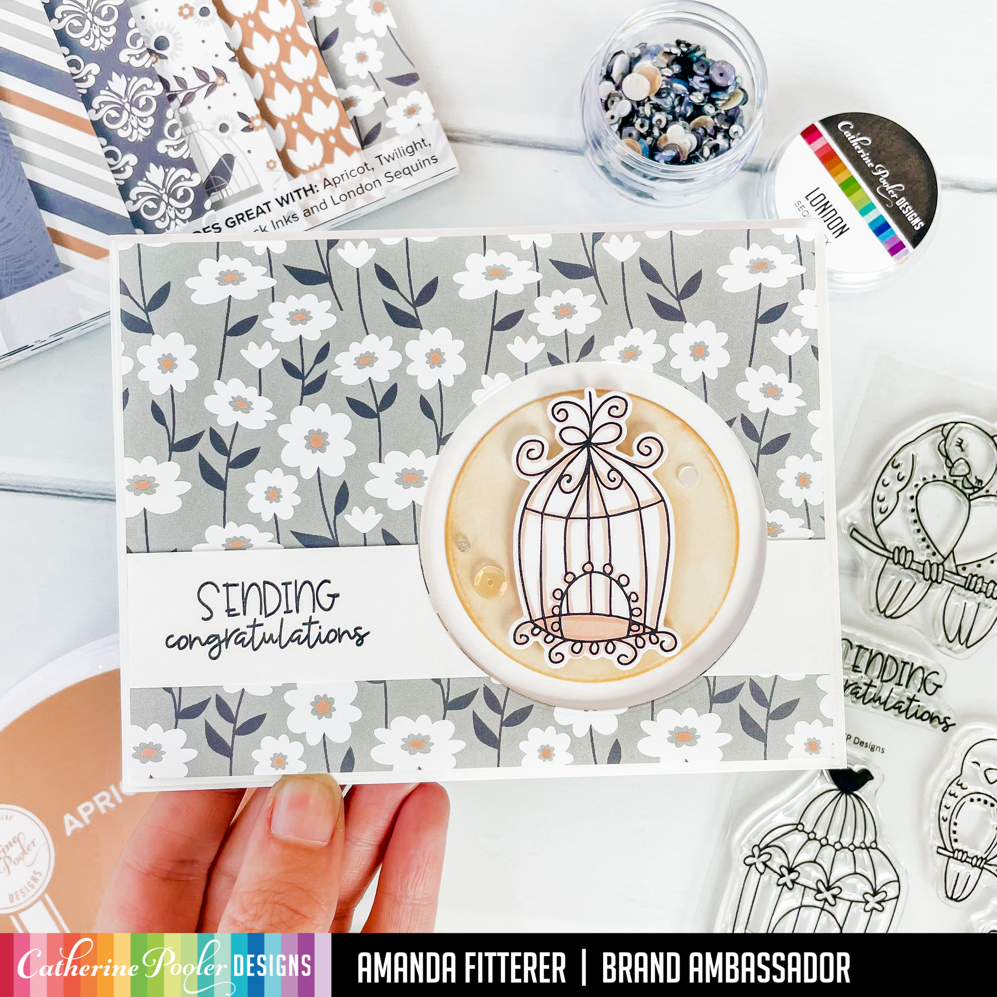 I stamped my birdcage with black ink and then used a Copic marker to lightly color it in. I propped my patterned paper up with 3D foam tape to create more dimension. I added some London Mix sequins to finish the card off!
