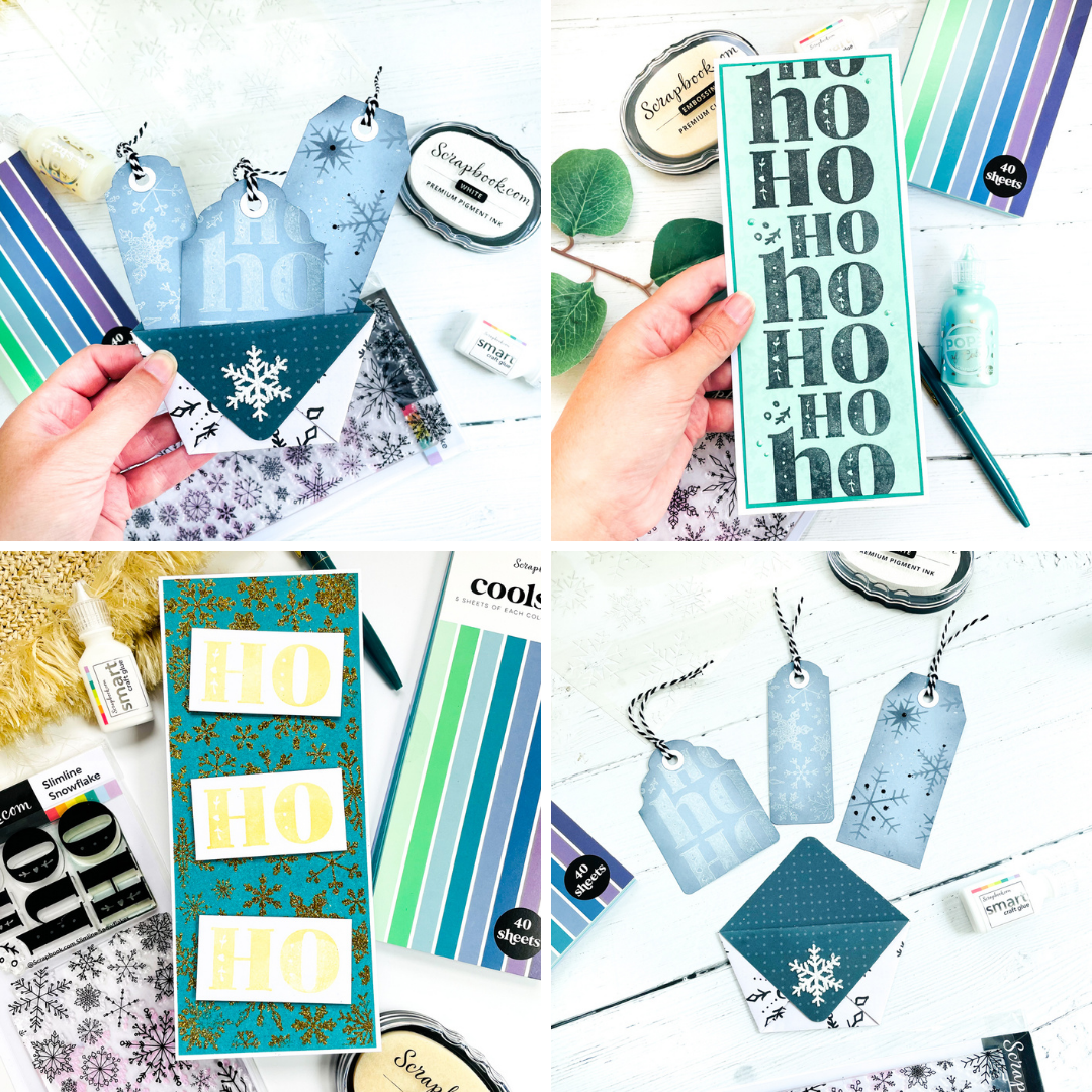 I’m grabbing my Scrapbook.com Premium Clear Ink Pad and the Slimline Snowflake stamp set. Using my MISTI, I’m placing my Cools Smooth Slimline colored cardstock into the MISTI and stamping the snowflakes with the clear ink. This will create a “watermark” effect in my background that looks really cool in person. Next, I’m stamping my “Ho Ho Ho” all the way down the front of the card with Memento Tuxedo Black Ink. I’m using the Smart Glue to adhere my layers together and then adding some Seafoam Pops of Color for a finishing touch!
