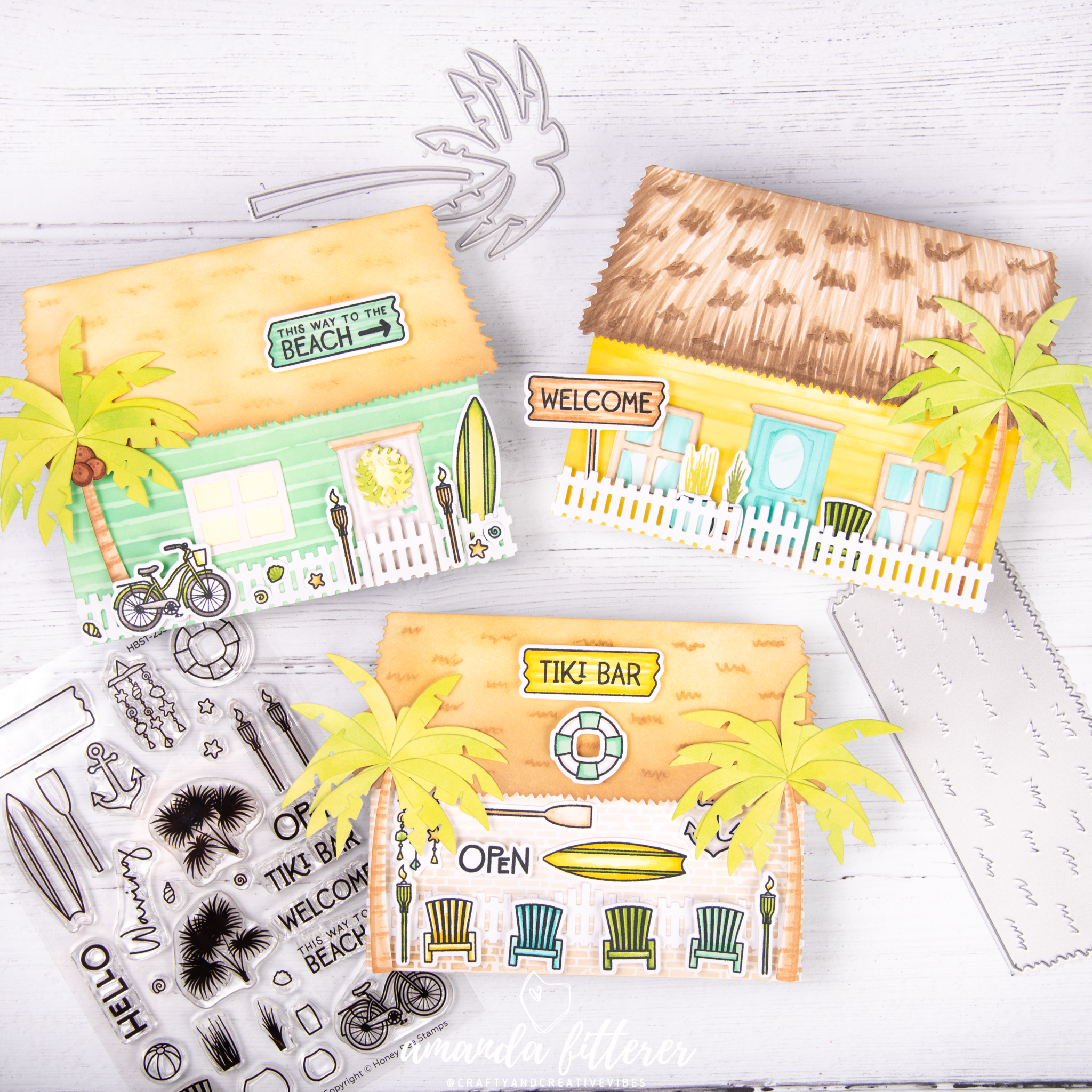 Now I’m ready to start adhering my cards together! The process is the same for each card, so I’m only showing one house below. I am using 3D foam squares and strips for items I want to stick out (such as the palm tree, bike, and tiki torches). I am using a glue pen for tiny things, such as the leaves on the wreath and the palm leaves. I am using double sided tape for the fence.